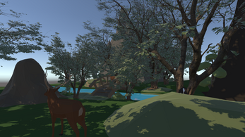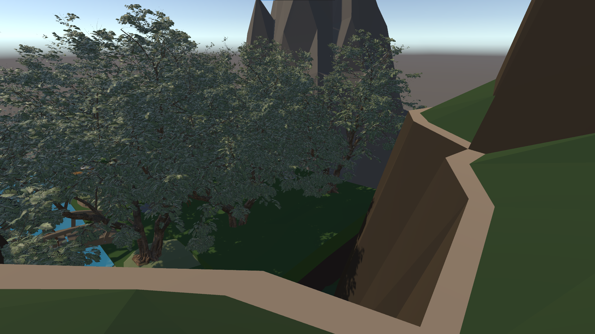 When building my world, I was inspired by nature, forests and gardens with one specific architectural feature, like a bridge, as a focal point among lots of greenery. So I created a scene with a lot of different types of green plants and trees around my world, as well as different animals like deer and multicolored fish, a small river that runs into the ocean below, and dark gray mountains surrounding the scene. In the ocean, there are blue and red fish, pink starfish, snakes, and hidden pyramids below the water. Above, in the forest, I included families of animals to make it feel more realistic, like a mother doe and fawn, schools of fish, and a family of ducks. I wanted to create a feeling of serenity and calm with the muted, natural colors and the animals all around. I also wanted players to have a sense of curiosity and explore the world to find small details, like a small duck lost from its family, a wolf looking at the family of ducks, the deer standing on the bridge alone, and other moments. For example, hidden behind the mountains, there are a giant shark, duck, elephant, and polar bear, so people playing the game might be surprised if they decide to climb over and around the tall mountains to the back of the world where they wouldn’t expect to see more animals. I don’t think there is any story that would take place in my world. One of my favorite parts of this world is the sharp, geometric mountains behind the more organic structures of the trees and leaves and the different colors that work in a harmonious way. Overall, my goal with this project was to explore and experiment with this new and unfamiliar software and become accustomed to it.